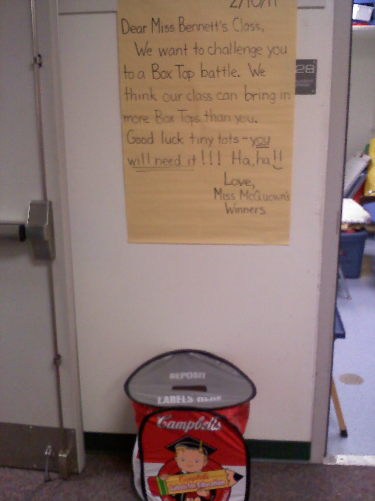 It is February Frenzy and we are in a huge competition!!! Please help us win by sending in your box tops and soup labels as soon as possible. The class at Cochran who collects the most by the end of the month… wins great prizes!! We are also in a friendly competition with Miss McQuown’s second grade class!! They believe they can bring in more box tops and soup labels than we can… but we are ready to prove them wrong!! Thanks in advance for your help!!